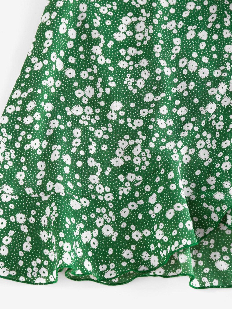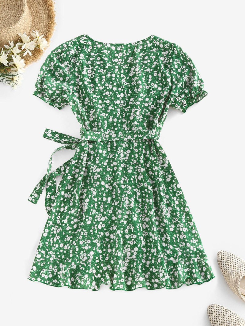 Ditsy Print Puff Sleeve Ruffle Belted Wrap Dress