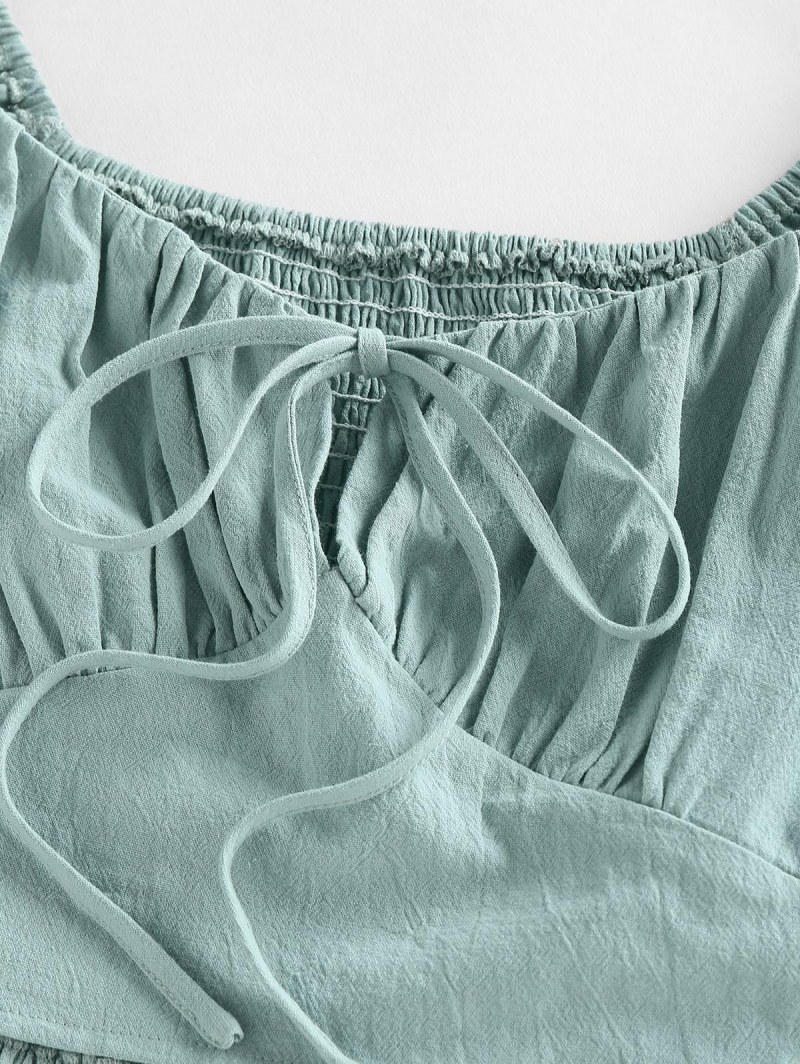 Shirred Ruffle Puff Sleeve Keyhole Crop Blouse