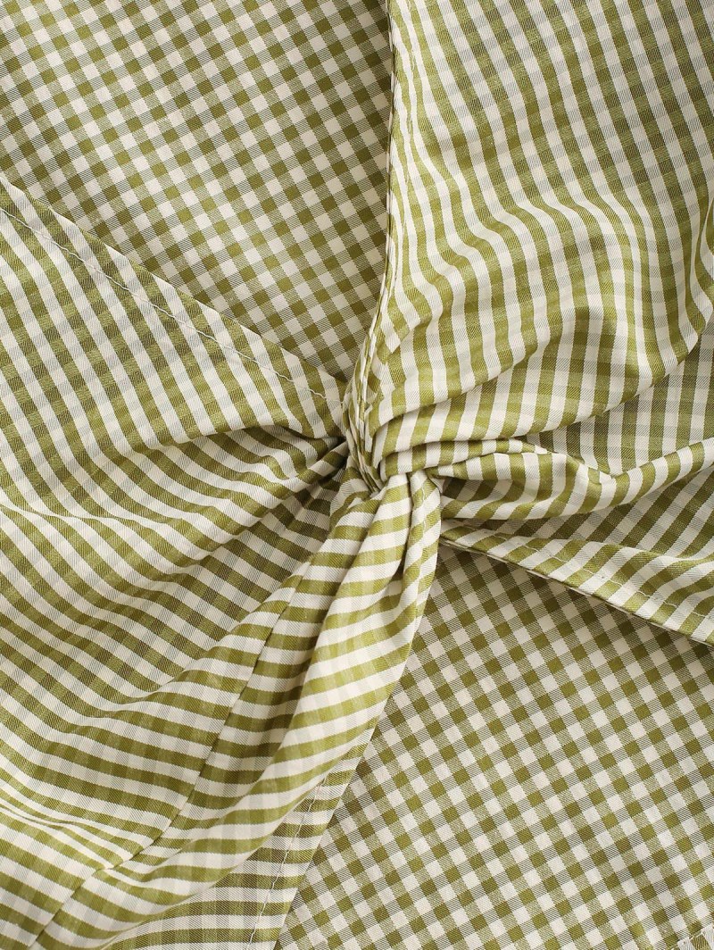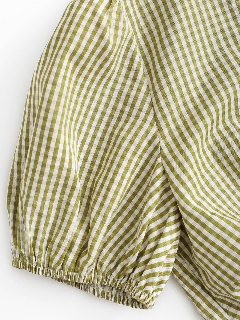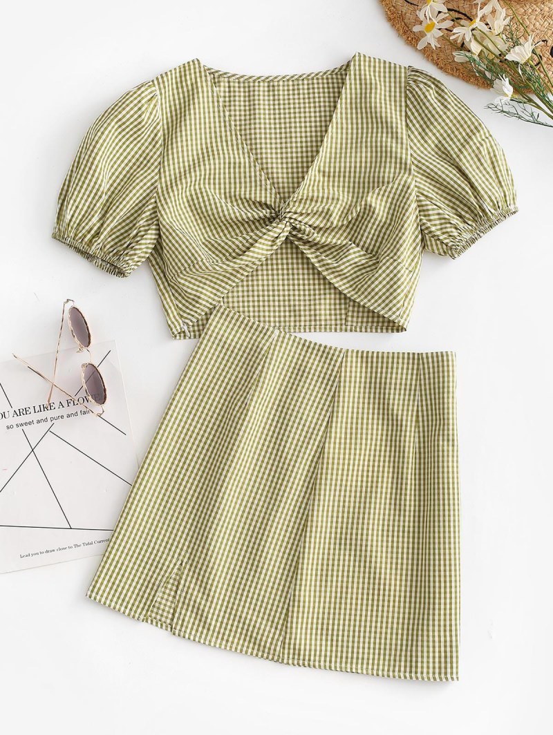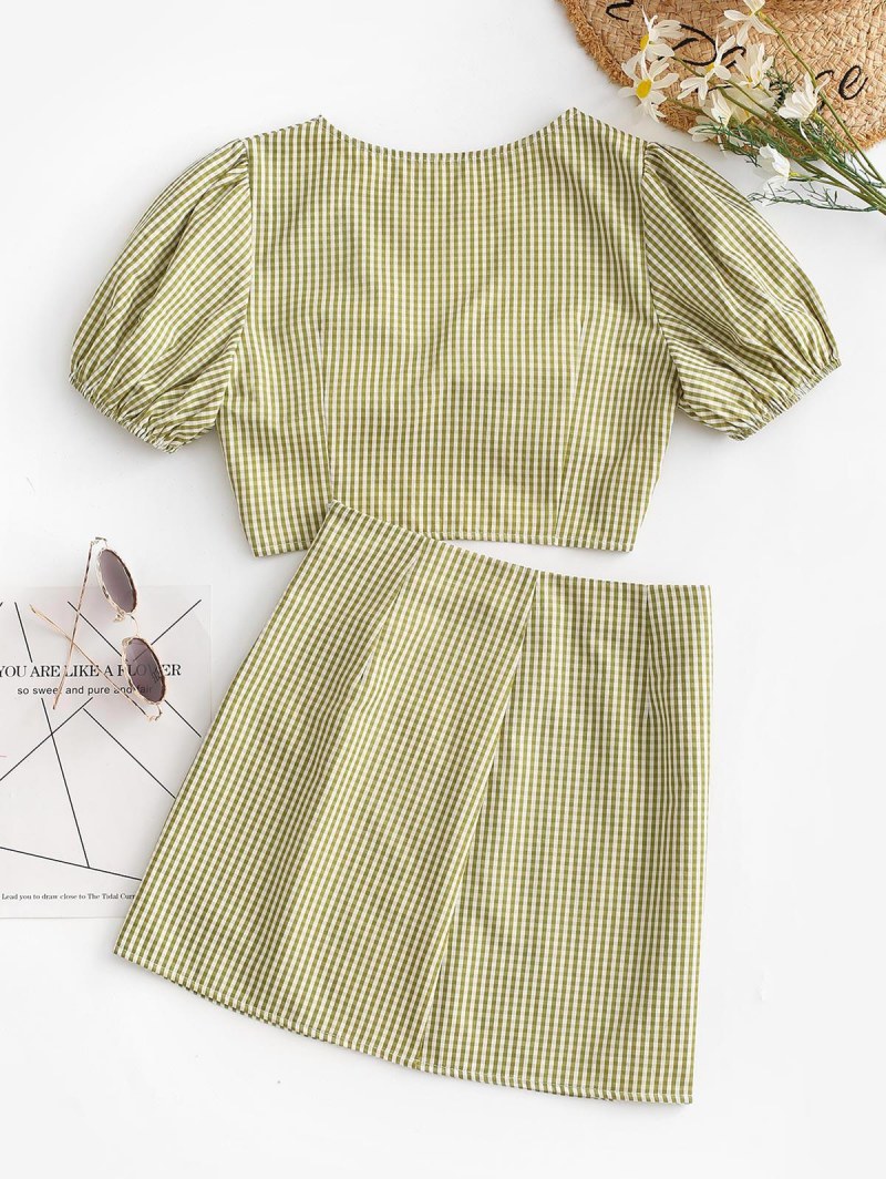 Gingham Puff Sleeve Front Twist Two Piece Skirt Set