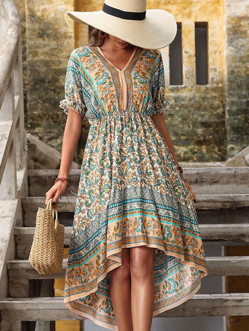 Bohemian Floral Print Ruffle Batwing Sleeve High Low Dress